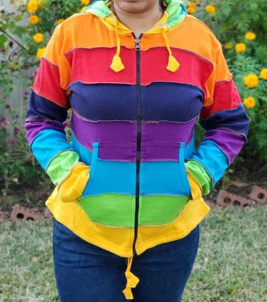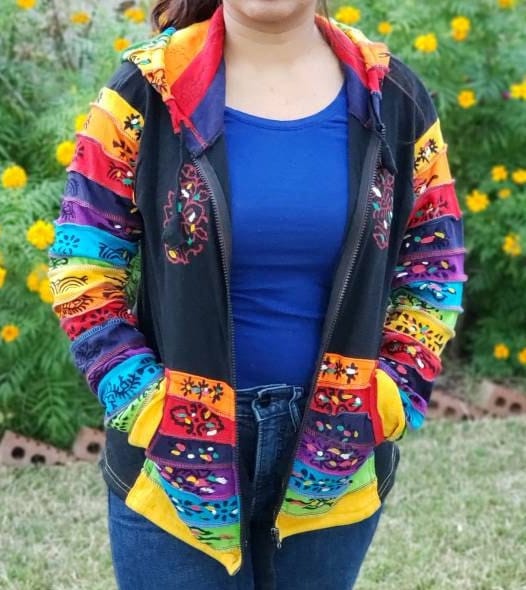 Namaste Printed Women's Fashionable Multicolor Stripped Rainbow Hippie Cotton Hoodie Handmade Jacket