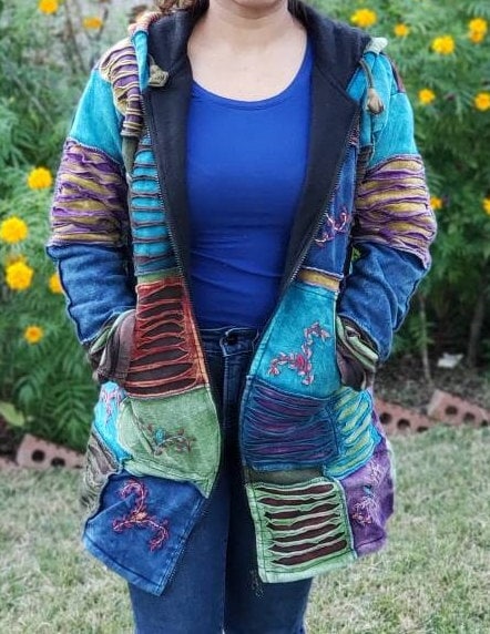 Namaste Handmade Women's Solid Green and Blue Cutting Themed Flower Stonewashed Fleece lined and non-fleece lined Long Hippie Cotton Jacket.