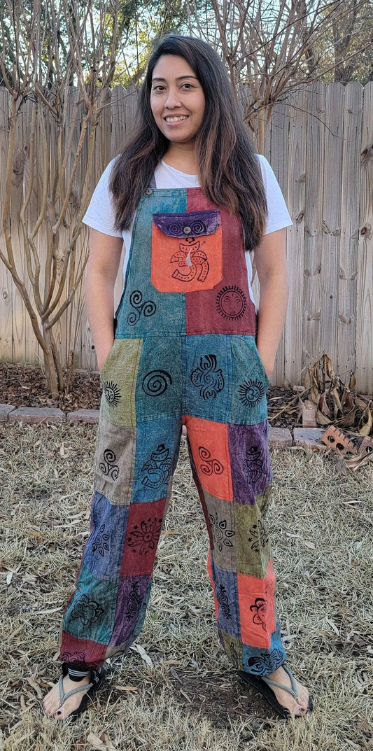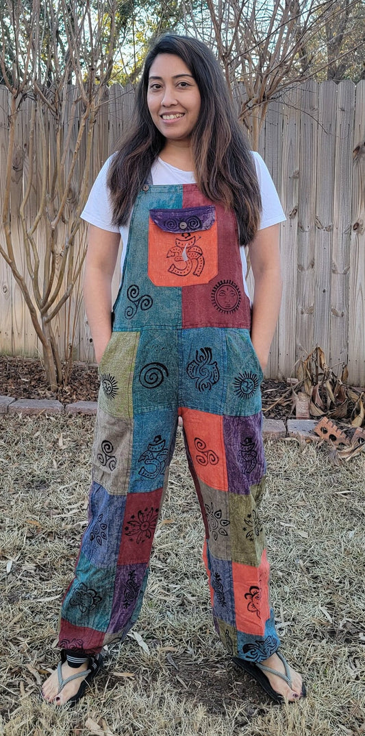 Namaste fashionable unisex multicolor stonewashed handmade hippie patchwork durable non acidic hippie cotton jumpsuit dungarees